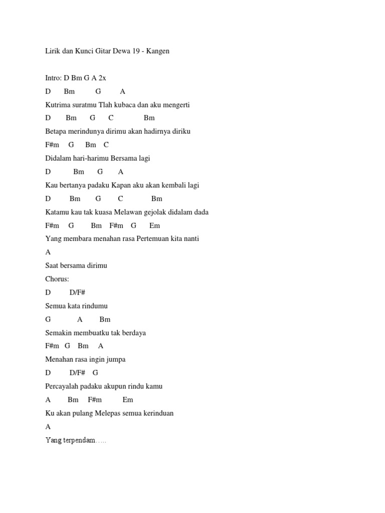 Lirik dan kunci gitar dewa 19 kangen lirik dan kunci gitar lagu hits terbaru lirik dan kunci gitar dewa 19 kangen. Selasa 10 desember 2019 2126. Chord dewa 19 kangen ku akan datang intro d bm g a 2x d bm g a kutrima suratmu tlah kubaca dan aku mengerti d bm g.