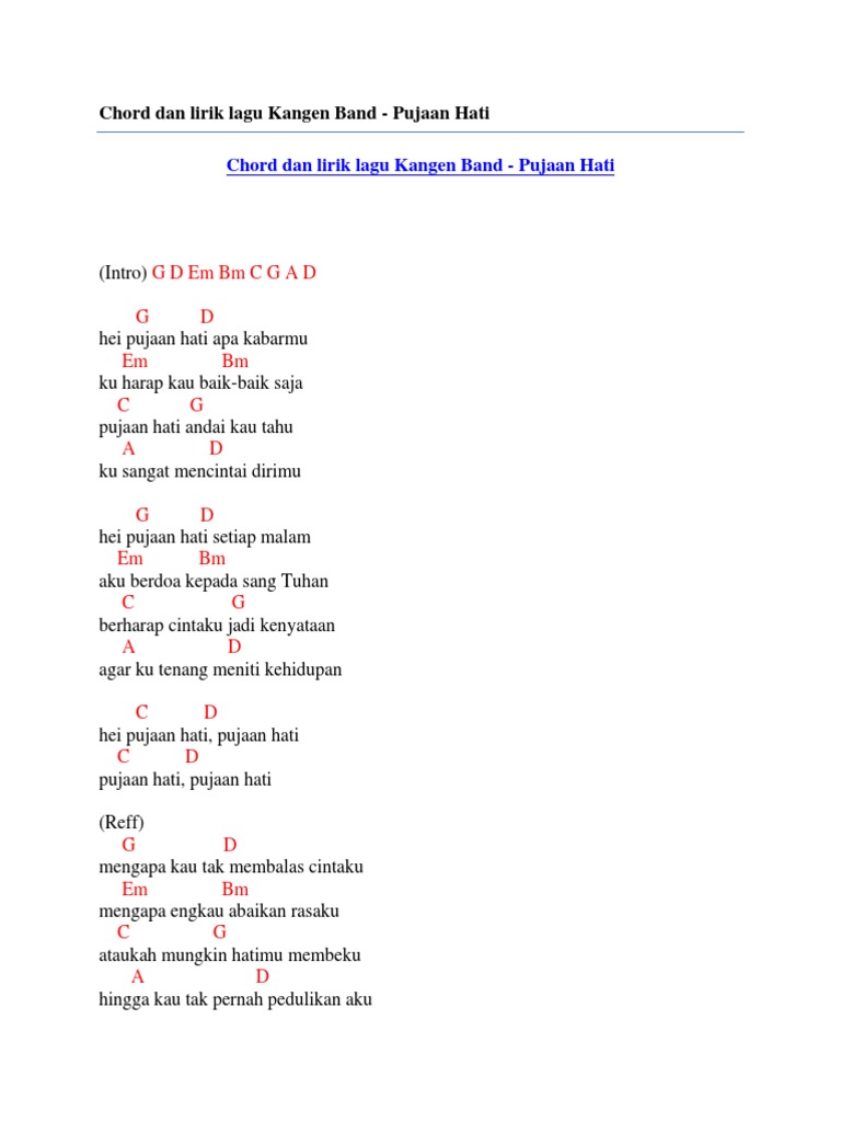 Kangen band pujaan hati chord intro a e fm cm d a b e a e hei pujaan hati apa kabarmu fm cm ku harap kau baik baik saja d a pujaan hati andai kau tahu b e ku sangat mencintai dirimu a e hei pujaan hati setiap malam fm cm aku berdoa kepada sang tuhan d a berharap cintaku jadi kenyataan b e agar ku tenang meniti kehidupan d e hei pujaan hati pujaan hati d e pujaan hati pujaan hati. Lagu kangen band dengan judul pujaan hati ini sekaligus dipakai sebagai judul album terbaru dari kangen band pujaan hati yang dirilis tahun 2009 dengan single andalan yang berjudul terbanglah bersamaku berikut lirik dan kunci gitarchords pujaan hati kangen band. C g hei pujaan hati apa kabarmu am em ku harap kau baik baik saja f c pujaan hati andai kau tahu.